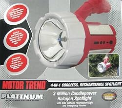3 Million Candlepower Cordless Rechargeable Spotlight With Cold Cathode Light. Cold Cathode Flourescent Light is a great continuous lighting source. Unit also has an emergency flasher. Ideal auto light and garage work light. Great for Camping, Fishing, Hunting, or Walking. Can be used for home security.